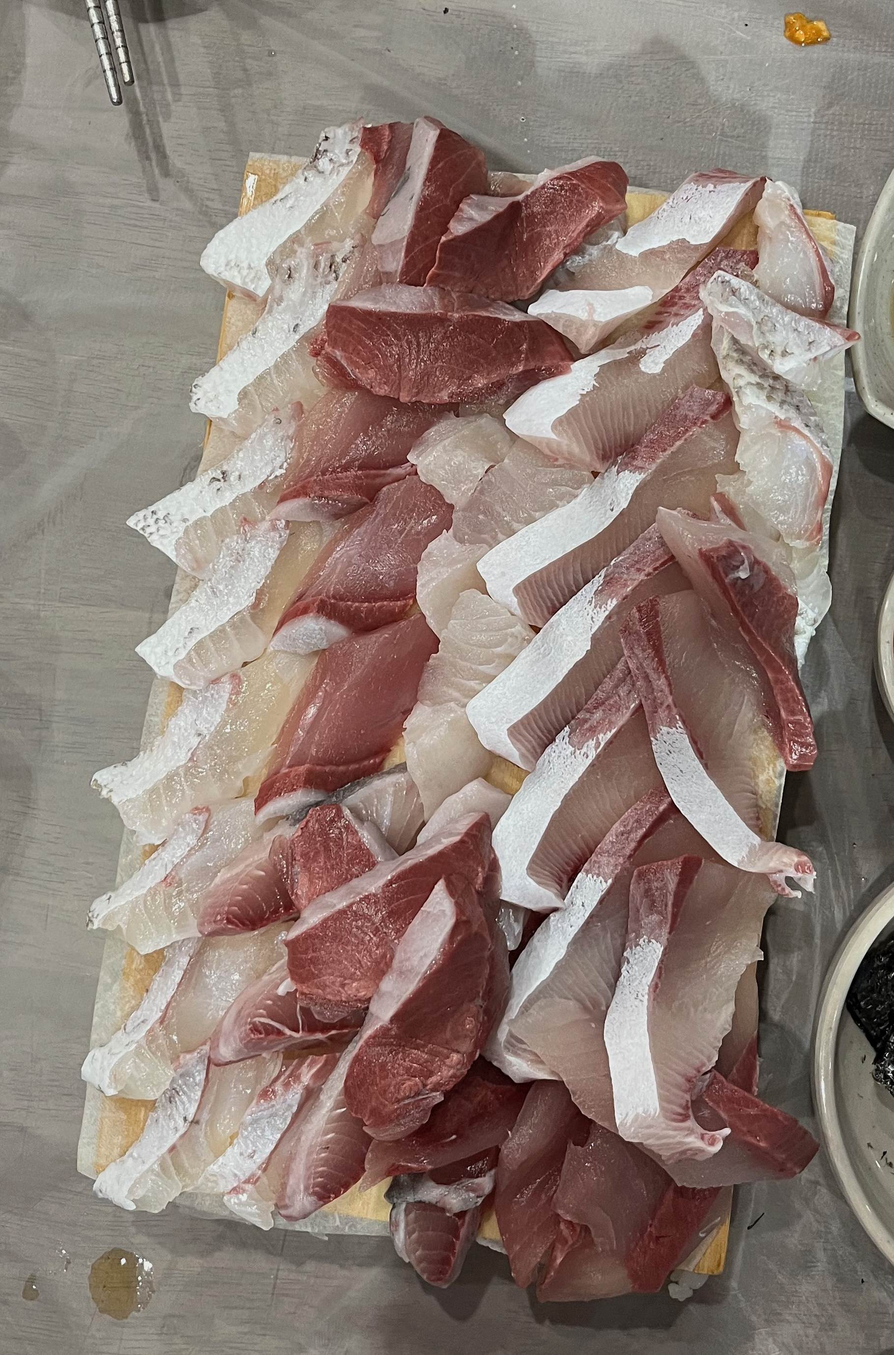 잠깐 말다툼이 있었지만, 그 후 바로 나온 회에 마음이 풀렸다. 첫번째 나온 회는 사진을 찍지 못했지만, 아래 회보다 다양한 종류의 회가 더 많이 나왔고, 아래 사진은 두번째 회다. 회의 양은 처음보다 살짝 작나 싶은데 방어 사잇살 등 더 고급 부위가 나왔다고 한다. 회가 늦게 나와 평소보다 더 많이 주었다고. 감사할 일이지. 사실 제주도 식당에서는 엄청난 친절을 기대해서는 안 된다. 보통은 팔면 팔고 말면 말지라는 생각이 많고, 서울말을 쓰면 관광객이기 때문에 큰 친밀감을 주려하지 않는 듯하다. 뭐 육지라고 다를까 싶지만.